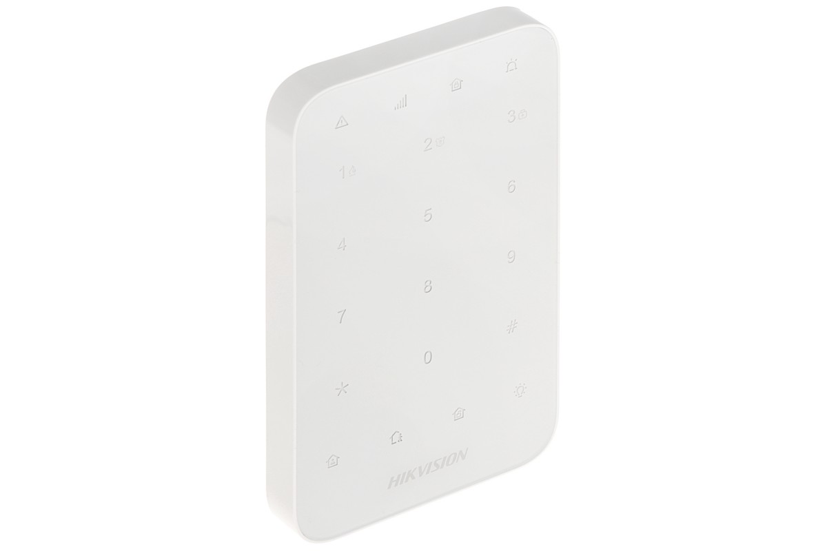 DS-PK1-E-WE является клавиатурой охранной панели, которая может быть подключена к AX PRO для контроля и управления тревожными событиями. Поддерживается извещение о тревоге при помощи индикатора и бипера.