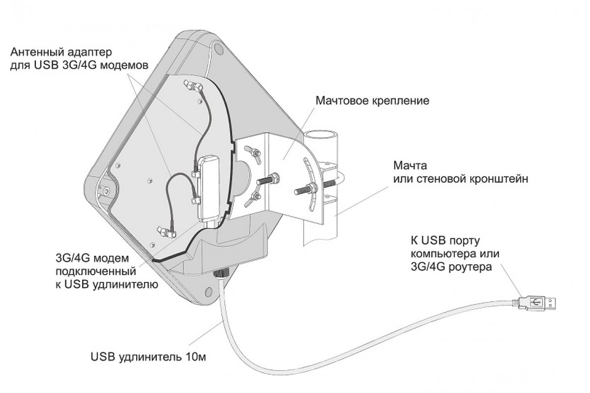 Панельная антенна 14dBi (1.7-2.2ГГц) для 3G/4G модемов (Мотив,Билайн,МТС,Мегафон,ТЕЛЕ2; LTE1800, UMTS2100, GPRS, EDGE, GSM1800) + гермобокс для модема + USB-удлинитель + адаптеры