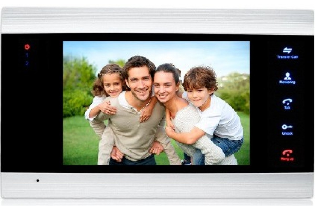 Монитор домофона с экраном 7 дюймов со встроенным блоком питания. Всё управление осуществляется сенсорными кнопками. Футуристический дизайн серебряного цвета, с черными вставками. Особенности: Подключение 2-х вызывных панелей,2 камеры видеонаблюдения, 4 дополнительный мониторов. Встроенный блок питания Сенсорное управление Возможность записи по движению видео или фото, на SD карту. Совместимость с большинством моделей отечественных вызывных панелей