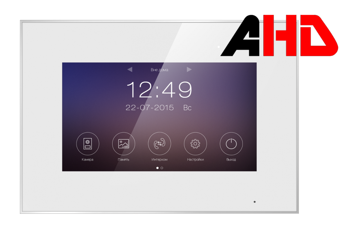 ИнструкцияДисплей TFT, цветной, сенсорный, 7 дюймов, 800x480 Формат видеосигнала вызывных панелей AHD 1080P / AHD 720P / CVBS Формат видеосигнала доп. видеокамер AHD 1080P / AHD 720P Управление Емкостной сенсорный экран Экранное меню Есть, с поддержкой русского языка Возможности подключения 2 вызывных панели, 2 камеры формата AHD, до 6 мониторов в системе (серии Promo) Тип подъездного домофона Нет Тип связи Без трубки Интерком Поддерживается Режим прослушивания других мониторов Нет Функция общего вызова Есть Режим <Не беспокоить> Есть Отображение календаря и времени на экране Есть Детектор движения для DVR Есть Запись фото Внутренняя память: 100 фото, 5 видео или SD карта : 500 фото и не менее 60 видео (зависит от емкости карты). Количество записанных видео фрагментов при записи по детектору движения зависит от емкости microSD карты. SD карта Формат SDHC, SDXC, от 8 до 128Гб, класс не ниже 6 Фоторамка Нет Автоответчик Нет Управление замком Через вызывную панель Переадресация вызовов на смартфон Нет Открывание замка со смартфона Нет Способ монтажа Накладной Подключение 4 провода (4х0,5 кв.мм) Питание 100 - 240В, 50/60 Гц или 14,5В/0,8А пост. ток. Потребление Не более 12Вт, 5 Вт (ожидание) Рабочая температура От 0 до +40 град.С Рабочая влажность 0-95% Размеры 222х154х15мм (без кронштейна)